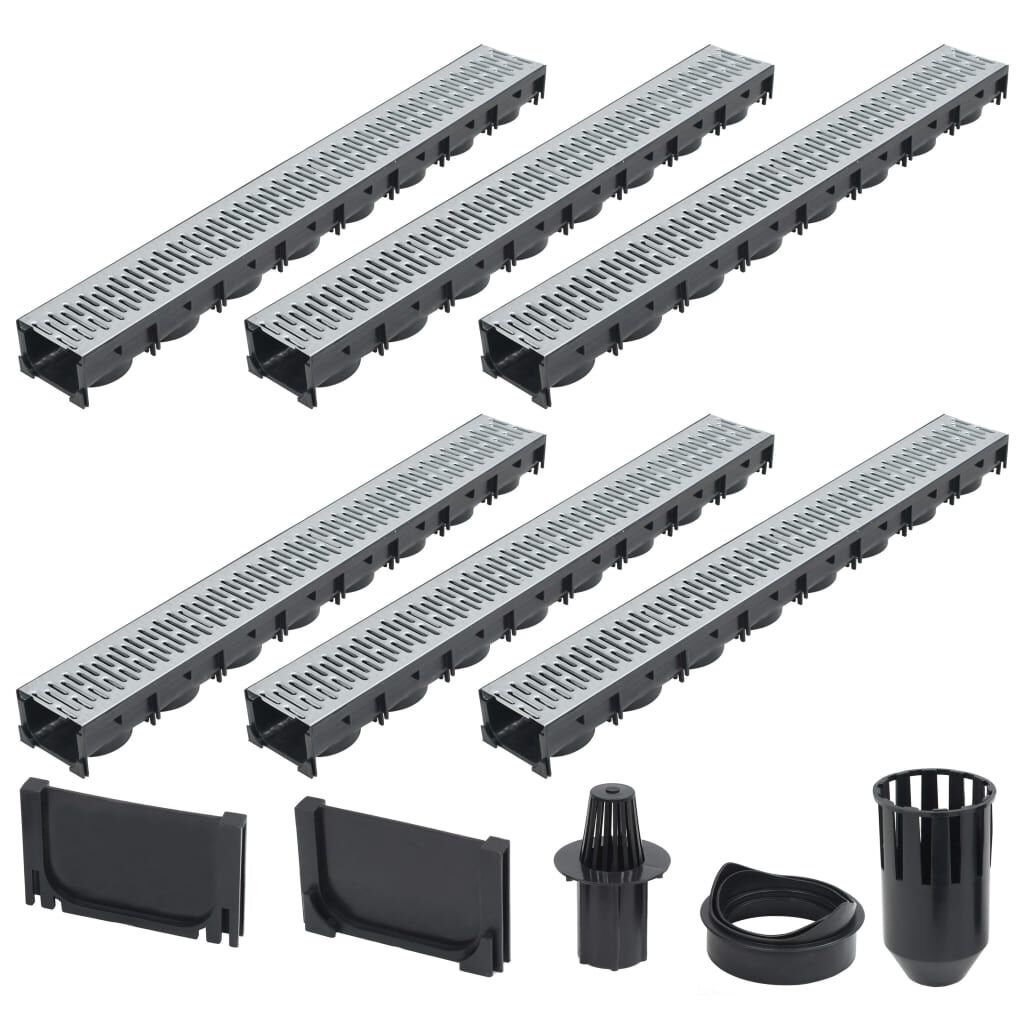 Acest set complet este alcătuit din 6 canale de drenaj cu grătare din oțel zincat, 1 sistem de filtrare, 1 conector de evacuare inferior și 2 capace de capete. Acest set reprezintă o soluție perfectă pentru colectarea și îndepărtarea excesului de apă de pe drumurile de acces, terase și alte zone exterioare.