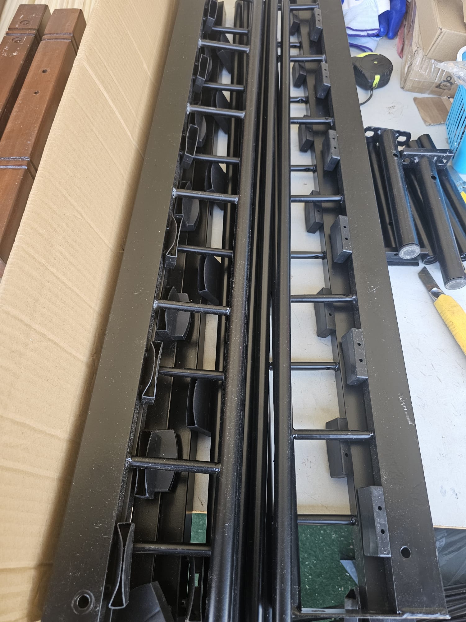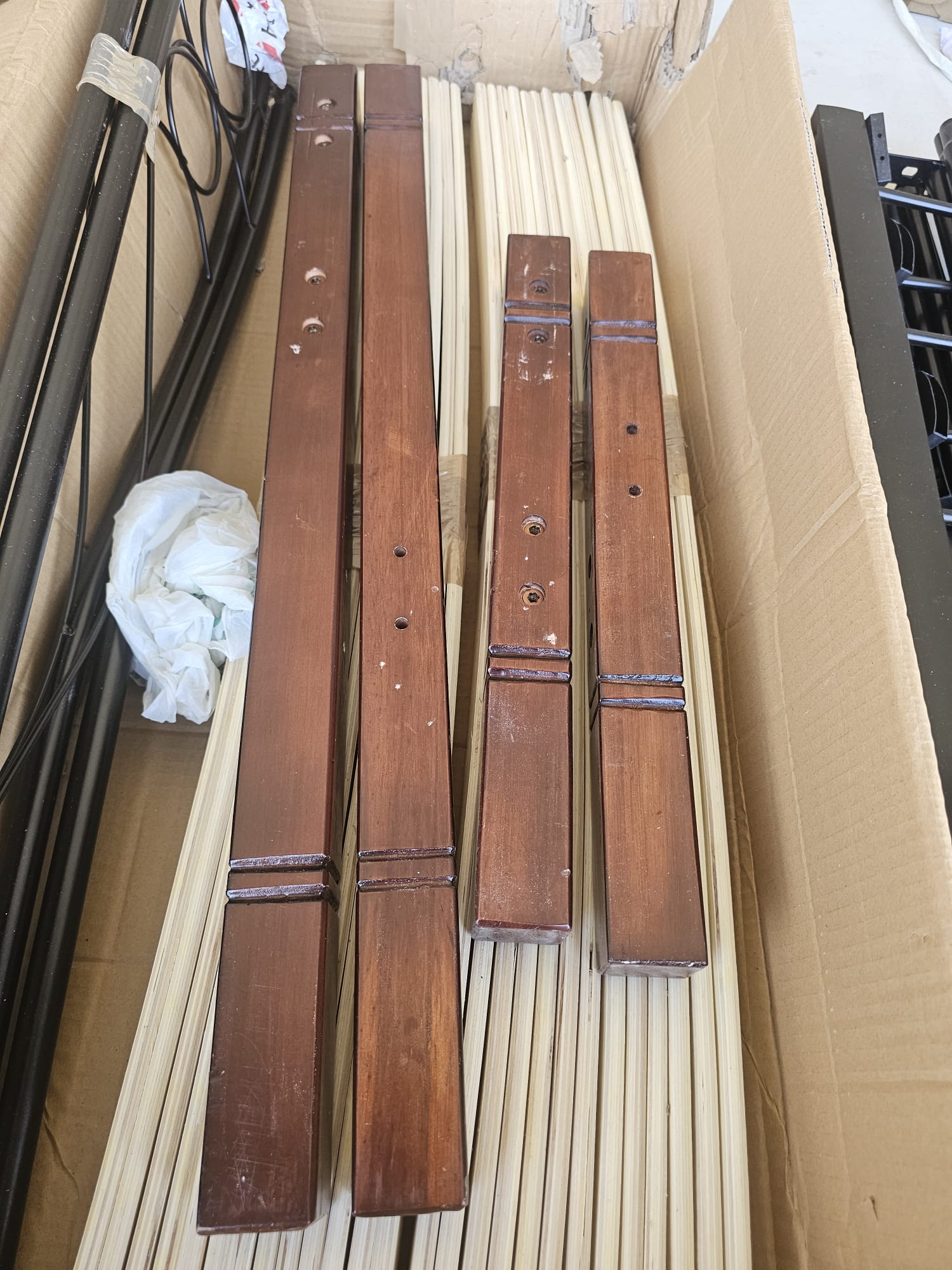- Material: Cadru din metal + șipci din placaj
