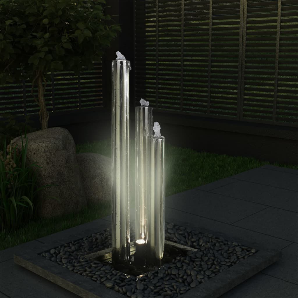 Această fântână de grădină lucioasă din oțel inoxidabil cu design cu trei cilindri este echipată cu un bec LED și o pompă. Vă va transforma grădina sau terasa într-un loc de relaxare, ce vă va încânta privirea și auzul.Fântâna de grădină este proiectată pentru a garanta un flux constant și uniform de apă. Este dotată cu o bază din plastic, care poate fi îngropată în pământ pentru a crea efectul special. Tava din oțel inoxidabil montată pe partea superioară a bazei este decorată cu pietricele. Cascada este livrată cu toate accesoriile necesare. O puteți conecta cu ușurință la pompa de apă inclusă. Este realizată din oțel inoxidabil 304 de înaltă calitate, cu finisaj lucios, fiind rezistentă la clor și foarte durabilă. Acest produs are nevoie de asamblare.SpecificațiiCuloare: ArgintiuMaterial: Oțel inoxidabil cu finisaj reflectorizant (SS 304)Dimensiuni (inclusiv baza): 48 x 34 x 88 cm (L x l x î)Dimensiuni cilindri: 7,5 x 65/50/34 cm (diam. x î)Capacitate recipient de apă: 50 LLungime cablu de alimentare: 5 mCu o bază din plasticPompa:Alimentare: 220-240 V ~, 50 HzPutere: 25 WGrad de protecție: IPX8Debit: 1500 L / hIluminare LED:Culoare lumină: Alb caldTensiune: DC 12 VPutere: 1 WGrad de protecție: IP44Pachetul de livrare conține:1 x Fântână de grădină1 x Pompă1 x Adaptor1 x Bec LED1 x Pachet de pietriceleEAN:8719883762067SKU:48090Informații privind siguranța și conformitateaAcest produs nu este destinat utilizării de către persoane (inclusiv copii) cu capacități fizice, senzoriale sau mentale reduse sau cu lipsă de experiență și cunoștințe, cu excepția cazului în care acestea au fost supravegheate sau instruite cu privire la utilizarea produsului de către o persoană responsabilă pentru siguranța lor. Acest produs nu este o jucărie. Nu permiteți copiilor să se joace cu aparatul."