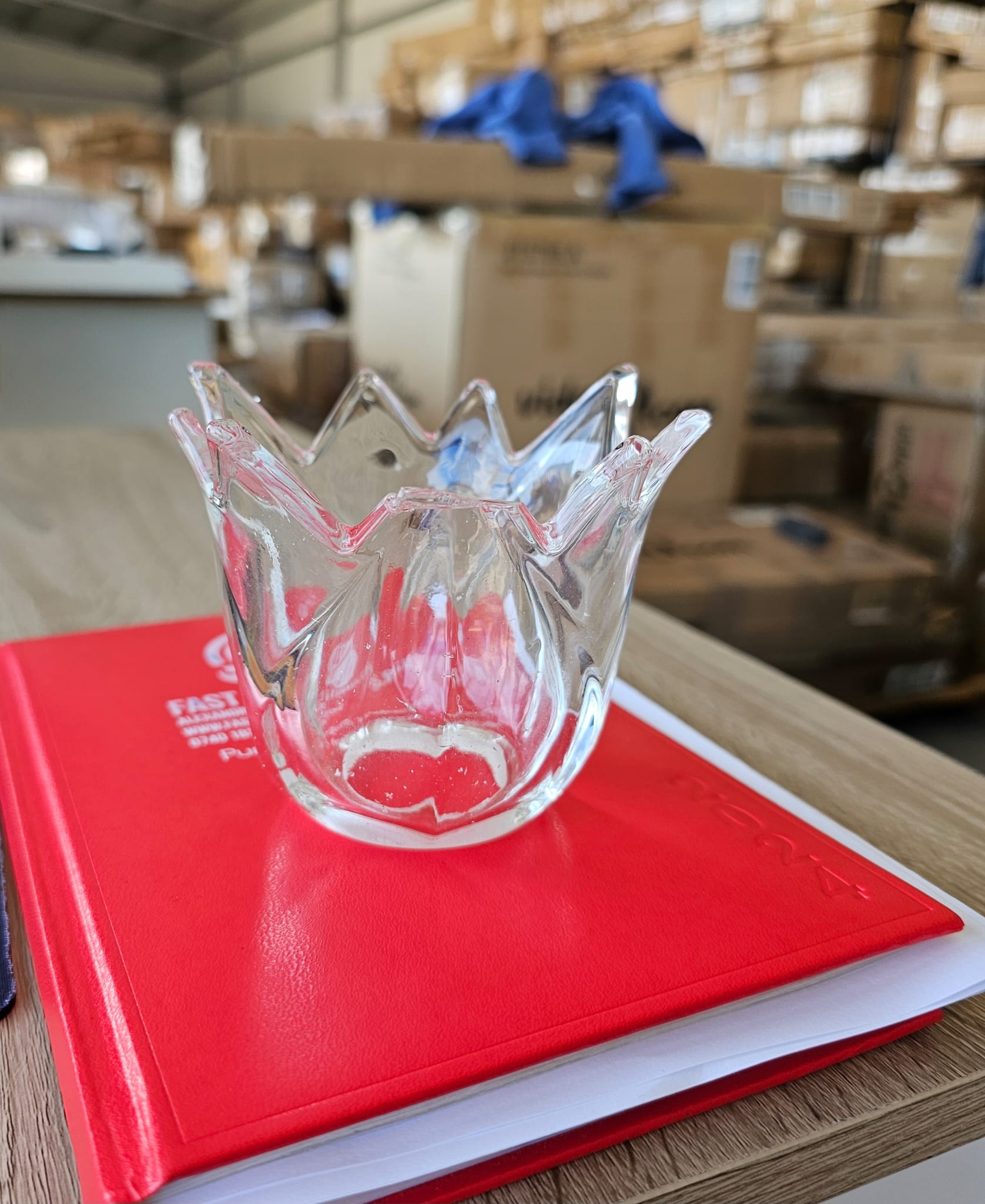 Lustră, abajururi din sticlă transparentă, 5 becuri E14, lalea