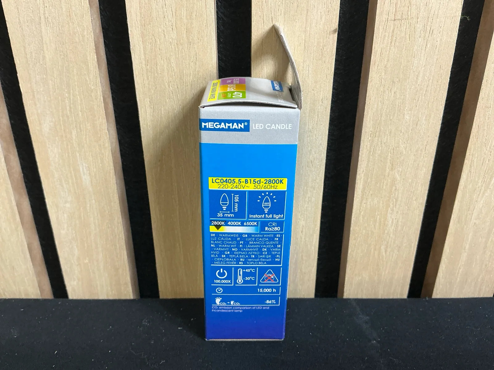 Bec LED tip lumânare MEGAMAN LED CANDLE cu soclu B15d, oferă lumină caldă și consum redus de energie. Ideal pentru lămpi decorative și candelabre.
